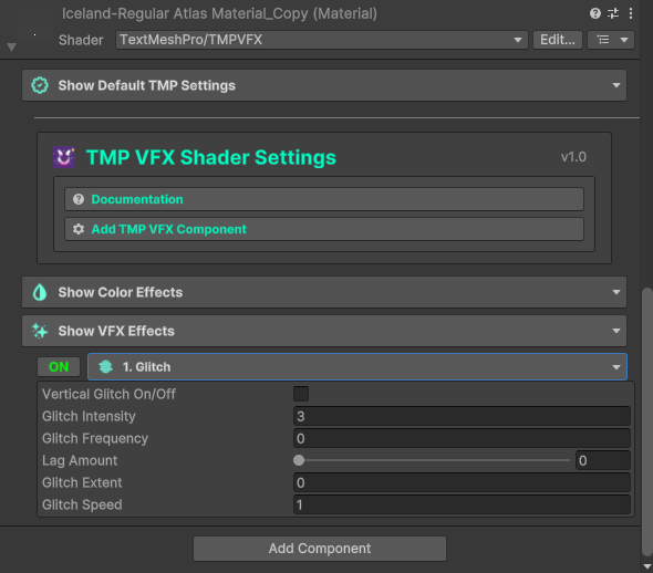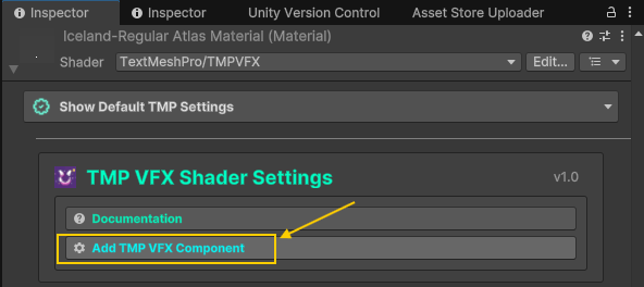 3. Scroll down in the Inspector, then click the <mark style="color:blue;">**Add TMP VFX Component**</mark> button under **TMP VFX Shader Settings**.