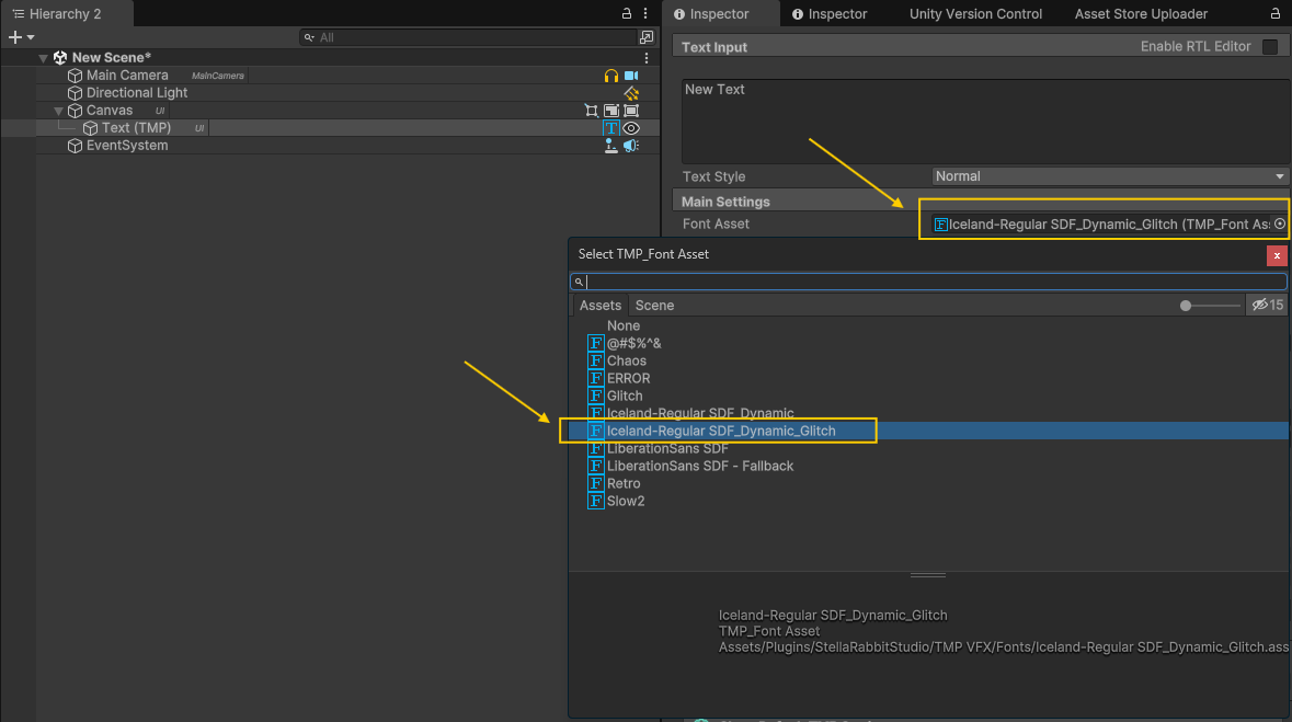 2. Set the <mark style="color:yellow;">**Font Asset**</mark> to <mark style="color:blue;">**Iceland-Regular SDF\_Dynamic\_Glitch**</mark>