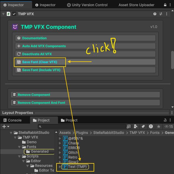 4. Scroll back up to locate the **TMP VFX Component**, then click the <mark style="color:blue;">**Save Font (Clear VFX)**</mark> button.