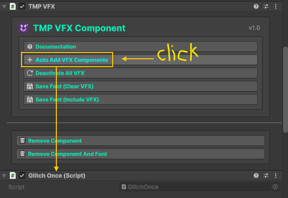 Scroll back up and click the <mark style="color:blue;">**Auto Add VFX Components**</mark> button in the <mark style="color:yellow;">**TMP VFX**</mark>**&#x20;Component** tab.