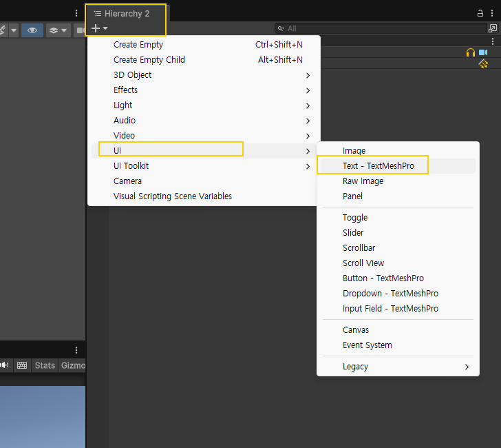 #### 1. Right-click in the Hierarchy window to create a <mark style="color:yellow;">Text - TextMeshPro</mark>